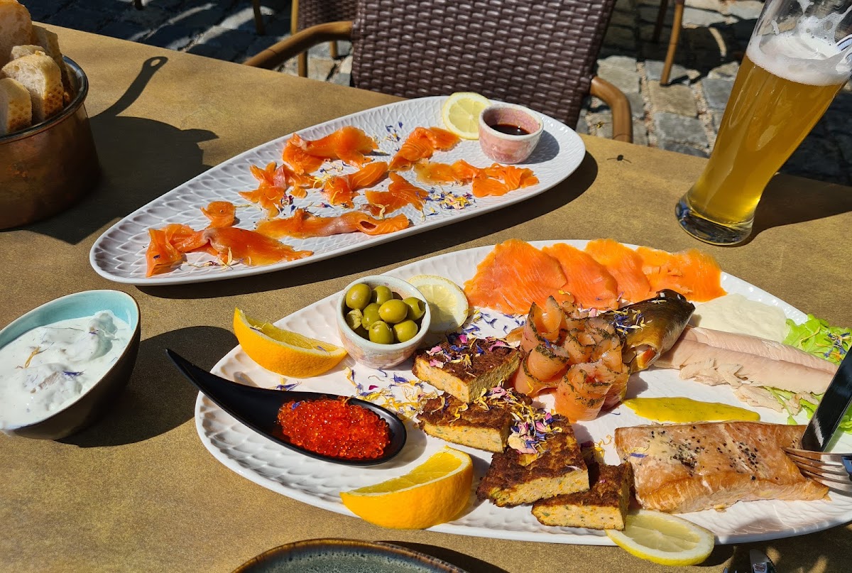 Vorweg, ich esse nur Fisch wenn ich ihn nicht mehr als solchen erkenne - dennoch aß ich Saiblingsfilet vom Grill mit Bratkartoffeln einem Salatmix, Remoulade und einem hervorragendem Roséwein. Ich war begeistert :) Mein Mann und mein Sohn aßen Steckerlfisch ( Forelle) mit Bratkartoffeln und Salat. Wir sind alles de3 Meinung, es war klasse. Kommen sicher wieder